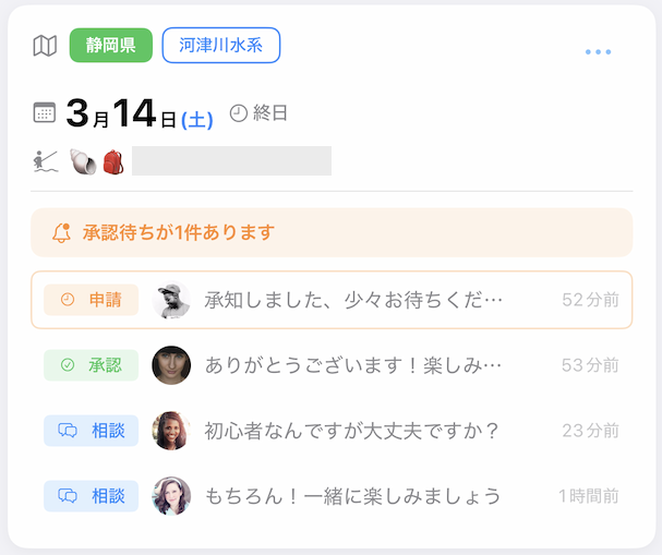 自分が主催するイベントのカードには、興味を持ってくれた人ごとの行を表示。誰がどの段階にいるかが一目でわかるデザインです。対応が必要な項目は背景色とボーダーで視覚的に強調しました。