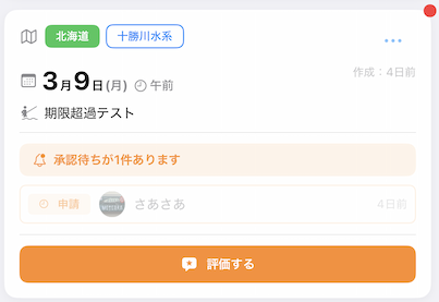 カードから釣行の相手を直接評価できるようにしました。以前は同じユーザーとの評価が1件しか持てない設計だったので、評価データに釣行ごとの識別子を持たせる形に変更し、同じ相手と複数の釣行で一緒になってもそれぞれ独立して評価できます。
